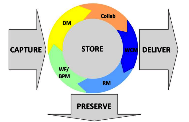 Die grundsätzlichen Funktionen der heutigen ECM-Lösungen zeigt das neben stehende Bild der AIIM, welches sich als Komponentenschaubild durchgesetzt hat. Demnach kann der kreisförmig dargestellte Lebenszyklus durch folgende Komponenten unterstützt werden: