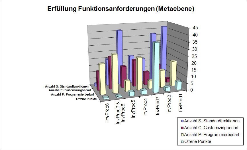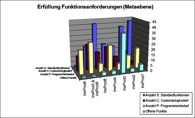 Für die Auswahl und Produktvergleichsrechnung sowie Risikobetrachtung hat man Fälle von mehreren Ländern aus den Erfahrungen der letzten Jahre zugrundegelegt und bewertet, welche Anforderungen sich mit Standardfunktionen, Customizing oder Programmierungleistungen abdecken läßt.